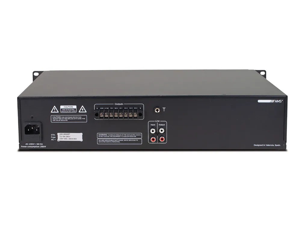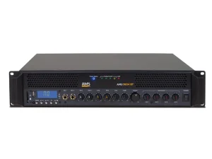 100v AmplifiersAMU 3604 BT is an installation mixer/amplifier which can work in low impedance (8-16 Ohm) as well as in 100V line. It includes 3 input sources (1 AUX + 2 MIC), being one MIC input (MIC 1) with priority. The unit incorporates a USB/SD/FM interface for external audio files as well as Bluetooth connectivity. Therefore, it is possible to send audio files from a smartphone or similar devices. The display shows all the audio track information, operating mode, volume level, track number or time elapsed.