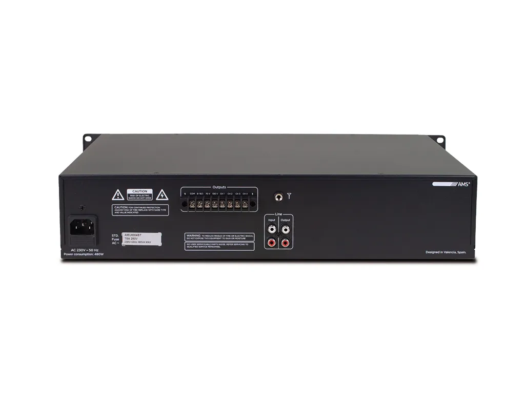 100v AmplifiersAMU 6004 BT is an installation mixer/amplifier which can work in low impedance (8-16 Ohm) as well as in 100V line. It includes 3 input sources (1 AUX + 2 MIC), being one MIC input (MIC 1) with priority. The unit incorporates a USB/SD/FM interface for external audio files as well as Bluetooth connectivity. Therefore, it is possible to send audio files from a smartphone or similar devices. The display shows all the audio track information, operating mode, volume level, track number or time elapsed.