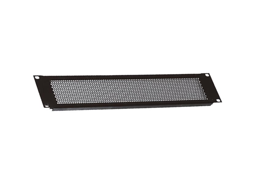 2 HU vented rack panel. Steel. 4 screw holes (included). 483 x 88 mm. Black colour.