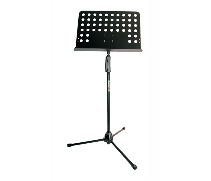 Music stand for larger music books or books with a fixed plate measuring 345 x 487 mm. Height adjustable in the range from 1165-1565 mm using a simple mechanism that can be operated with one hand.